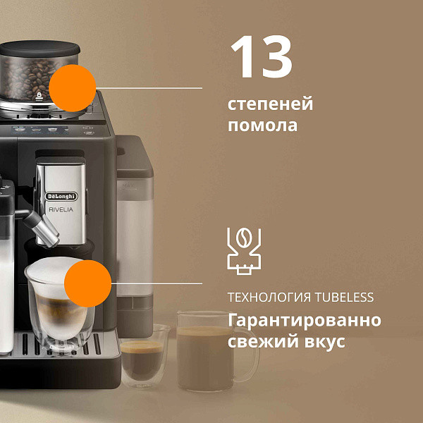 С Rivelia от De'Longhi вы сможете наслаждаться лучшим кофе, настроенным под ваш вкус и требования, в любое время дня. Кроме того, стильный и компактный дизайн с закругленными углами и черным оттенком оникса делает эту кофемашину прекрасным дополнением любой кухни или офисного помещения.